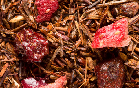 Rooibos (Aspalathus linearis), arômes (vanille, framboise, groseille, caramel, fraise des bois, cerise), morceaux de fraise, groseilles
