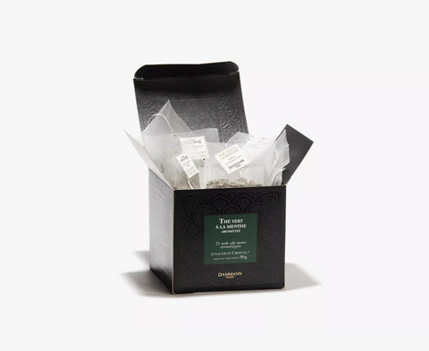 Inspiré de l’incontournable thé à la menthe marocain, notre thé vert à la menthe aromatisé allie en belles proportions, le thé vert Gunpowder à deux variétés de feuilles de menthe afin de créer une parfaite synergie. La communion entre la délicate menthe douce et la subtile fraîcheur de la menthe poivrée, toutes deux portées par le thé, vous offrira une infusion puissante et rafraîchissante. Selon la tradition, un thé à boire très chaud et sucré. Boîte de 25 sachets Cristal® Poids net : 50 g